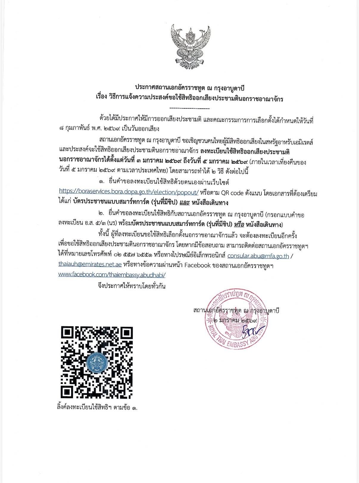 📣 สถานเอกอัครราชทูต ณ กรุงอาบูดาบีขอเชิญชวนคนไทยในยูเออีลงทะเบียนออกเสียงประชามตินอกราชอาณาจักร ซึ่งระบบลงทะเบียนจะเปิดตั้งแต่วันที่ 3-5 มกราคม 2569 (เวลาไทย)