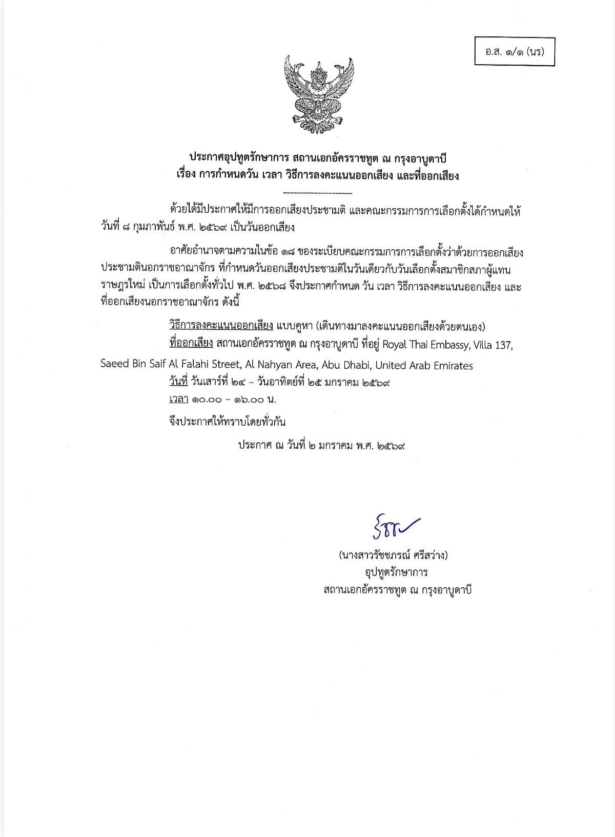ประกาศอุปทูตรักษาการ สถานเอกอัครราชทูต ณ กรุงอาบูดาบี เรื่อง การกำหนดวัน เวลา วิธีการลงคะแนนออกเสียง และที่ออกเสียง